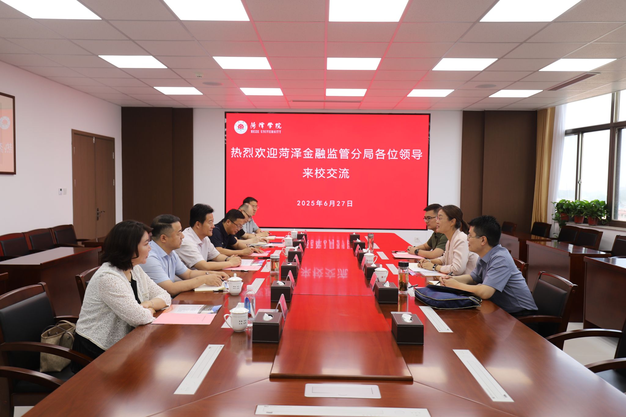 6月27日上午,菏泽金融监管分局党委委员、副局长明阳一行3人来我校考察交流。学校党委委员、副校长田智祥,党委委员、宣传部部长赵晓龙出席,财务处、合作发展处、团委、商学院负责人参加座谈。
